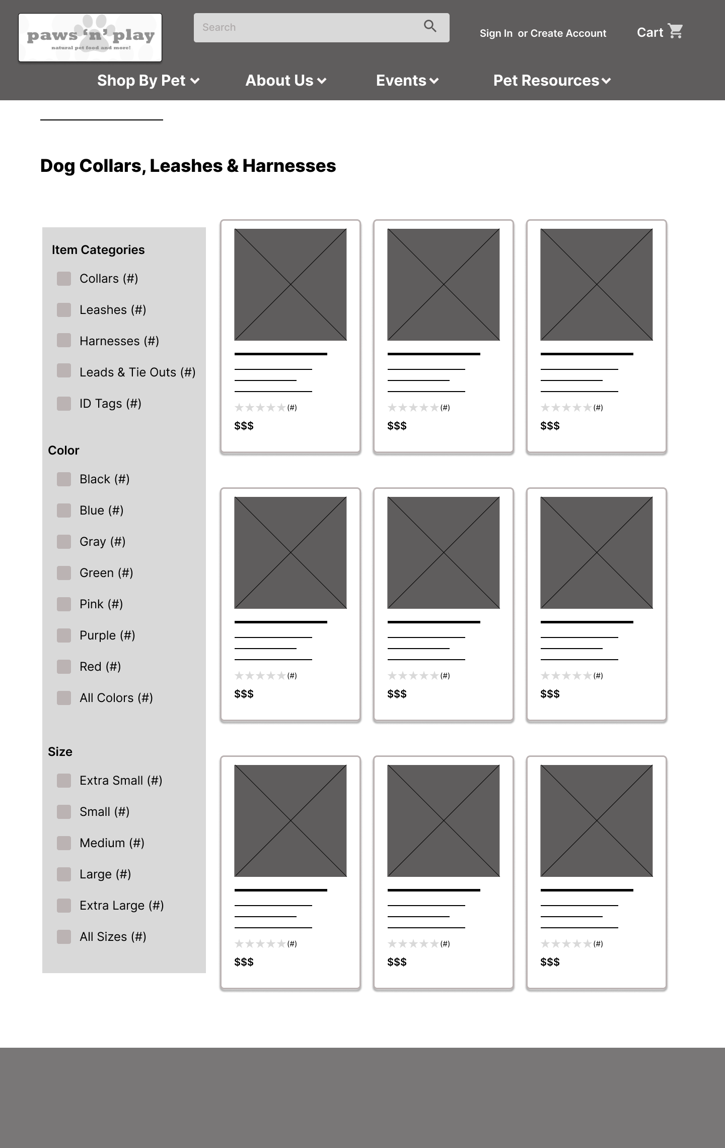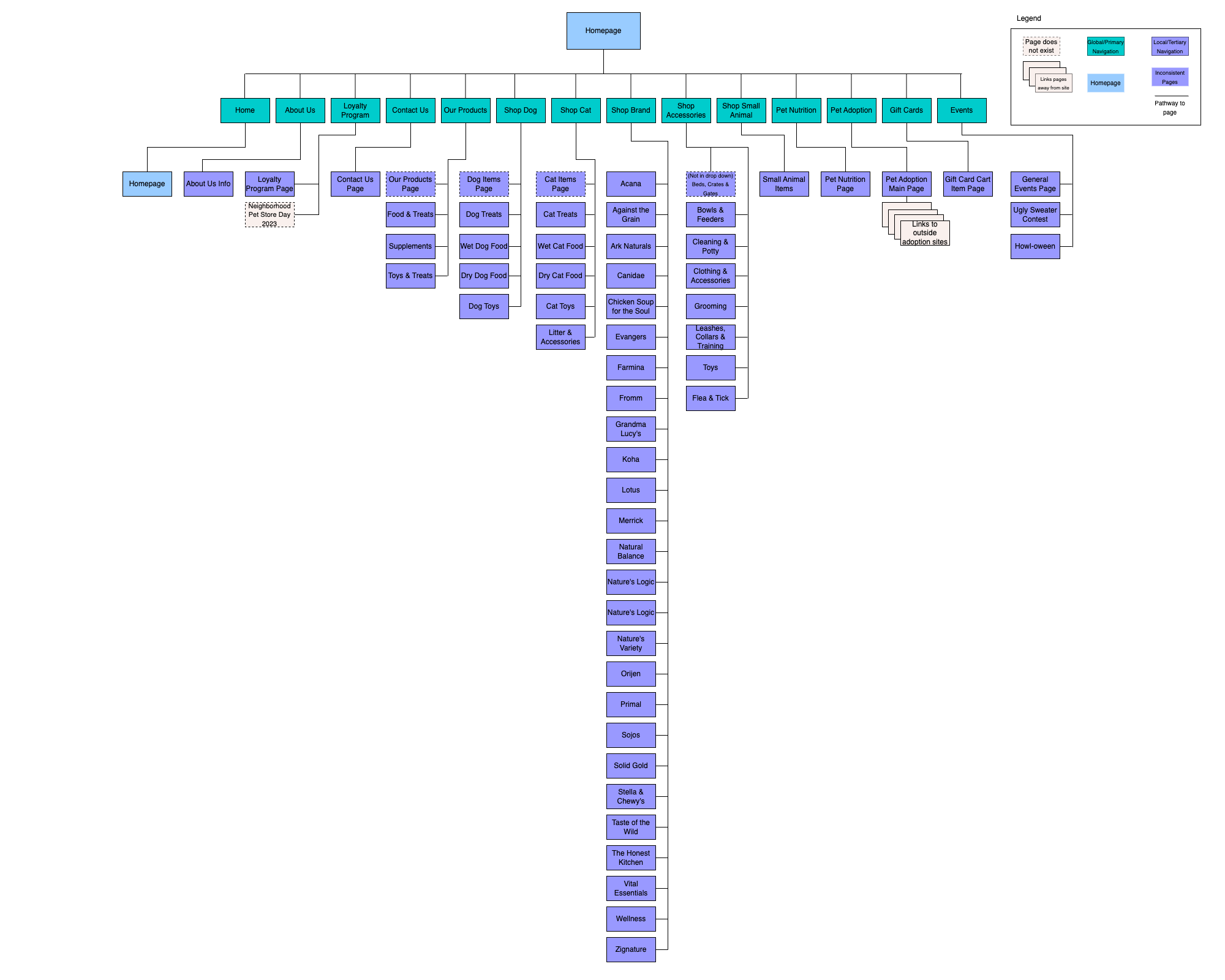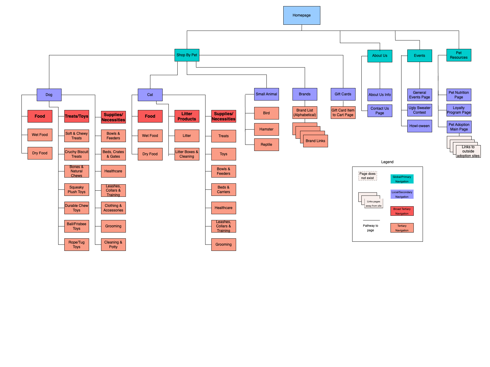 These findings meant I needed to design a site that supported both shopping habits. Products needed to be intuitively organized and easily filtered to offer the utmost convenience to those shopping for essentials, while also recreating the feeling of wandering aisles and organically finding a new toy or treat that might just edge out your pets existing favorite item.
